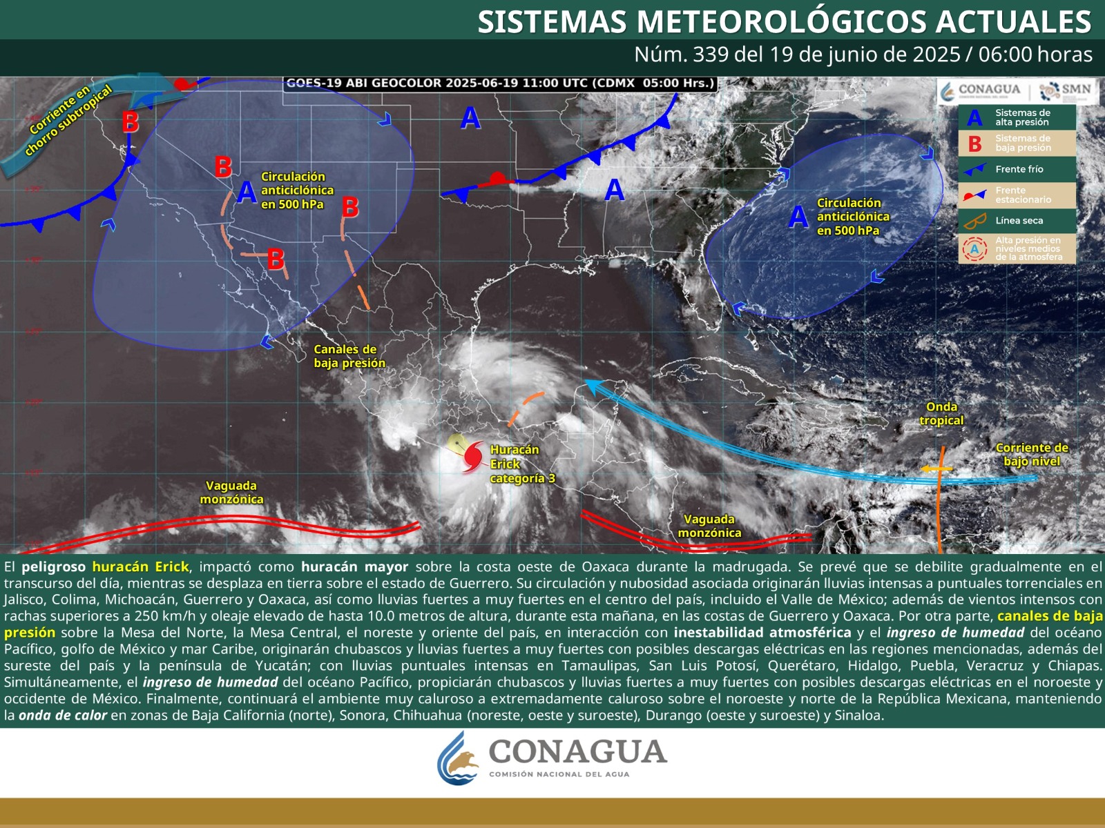 El peligroso huracán Erick, impactó como huracán mayor sobre la costa oeste de Oaxaca durante la madrugada.Se prevé que se debilite gradualmente en el transcurso del día, mientras se desplaza en tierra sobre el estado de Guerrero. Su circulación y nubosidad asociada originarán lluvias intensas a puntuales torrenciales en Jalisco, Colima, Michoacán, Guerrero y Oaxaca, asi como lluvias fuertes a muy fuertes en el centro del pais, incluido el Valle de México; además de vientos intensos con rachas superiores a 250 km/h y oleaje elevado de hasta 10.0 metros de altura, durante esta mañana, en las costas de Guerrero y Oaxaca.