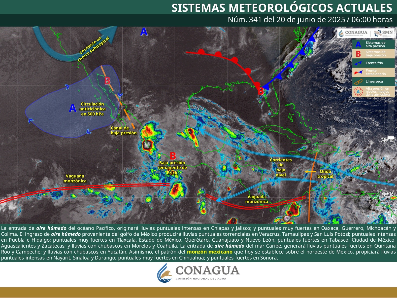 La entrada de aire húmedo del océano Pacífico, originará lluvias puntuales intensas en Chiapas y Jalisco; y puntuales muy fuertes en Oaxaca, Guerrero, Michoacán y Colima. El ingreso de aire húmedo proveniente del golfo de México producirá lluvias puntuales torrenciales en Veracruz, Tamaulipas y San Luis Potosí.