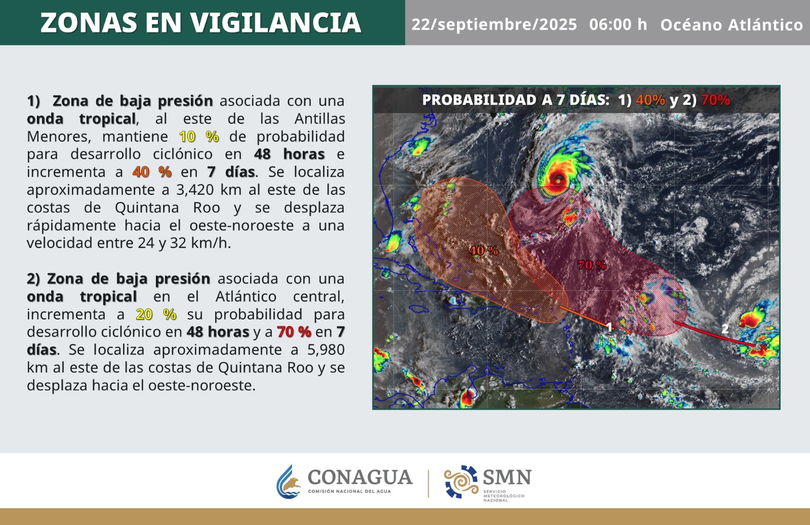 1) Zona de baja presión asociada con una onda tropical, al este de las Antillas Menores, mantiene 10 % de probabilidad para desarrollo ciclónico en 48 horas e incrementa a 40 % en 7 días. Se localiza aproximadamente a 3,420 km al este de las costas de Quintana Roo se desplaza rápidamente hacia el