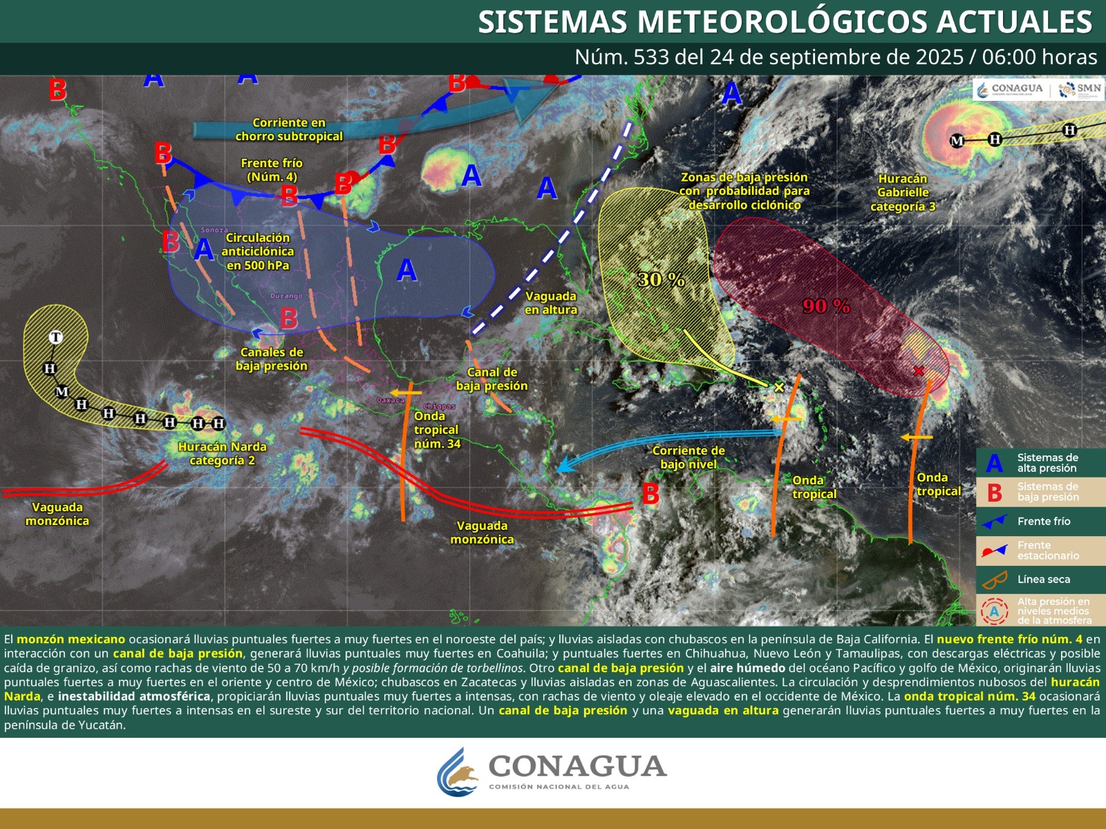 1) Zona de baja presión asociada con una onda tropical al noreste del mar Caribe. Mantiene 30 % de probabilidad para desarrollo ciclónico en 48 horas y 80 % en 7 días. Se localiza aproximadamente a 2,350 km al este de las costas de Quintana Roo y se desplaza hacia el oeste- noroeste a una velocidad aproximada entre 24 y 32 km/h.