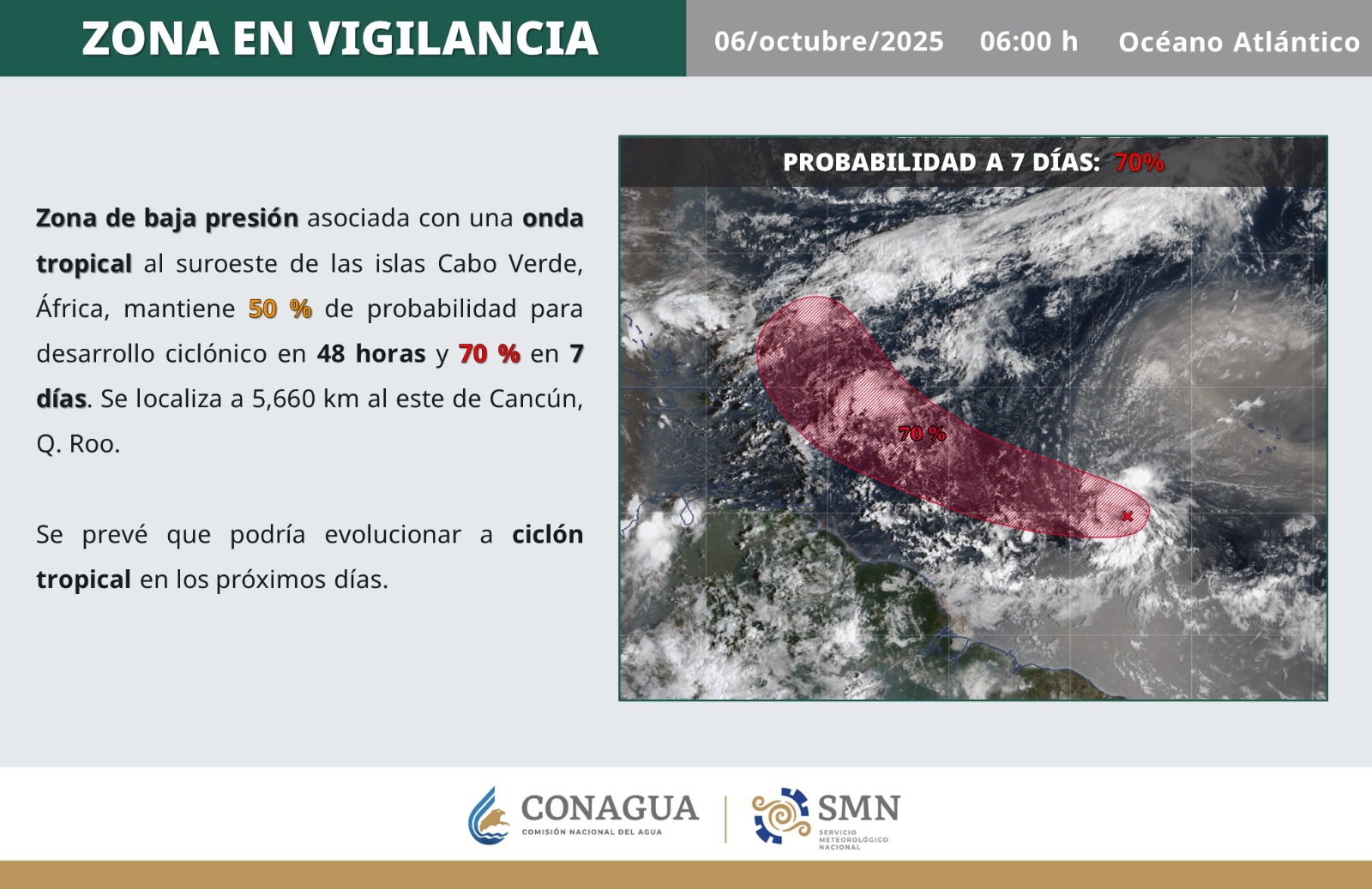 Zona de baja presión asociada con una onda tropical al suroeste de las islas Cabo Verde, África, mantiene 50 % de probabilidad para desarrollo ciclónico en 48 horas y 70 % en 7 días. Se localiza a 5,660 km al este de Cancún, Quintana Roo.