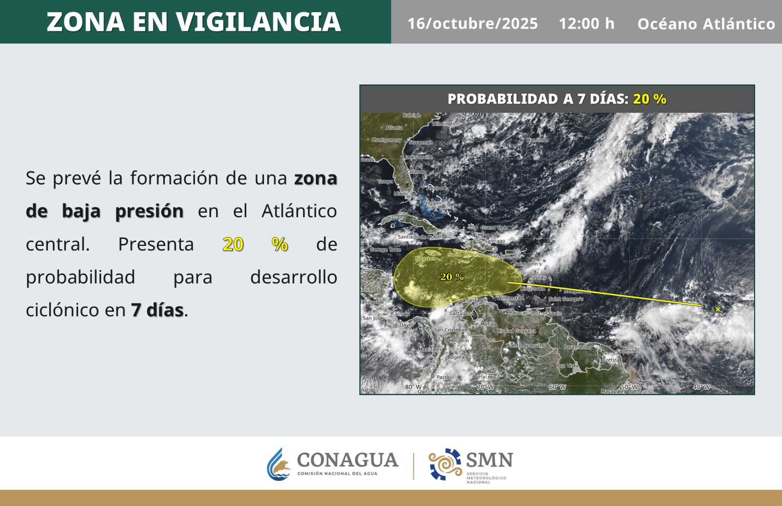 Se prevé la formación de una zona de baja presión en el Atlántico Central. Presenta 20 % de probabilidad para desarrollo ciclónico en 7 días.