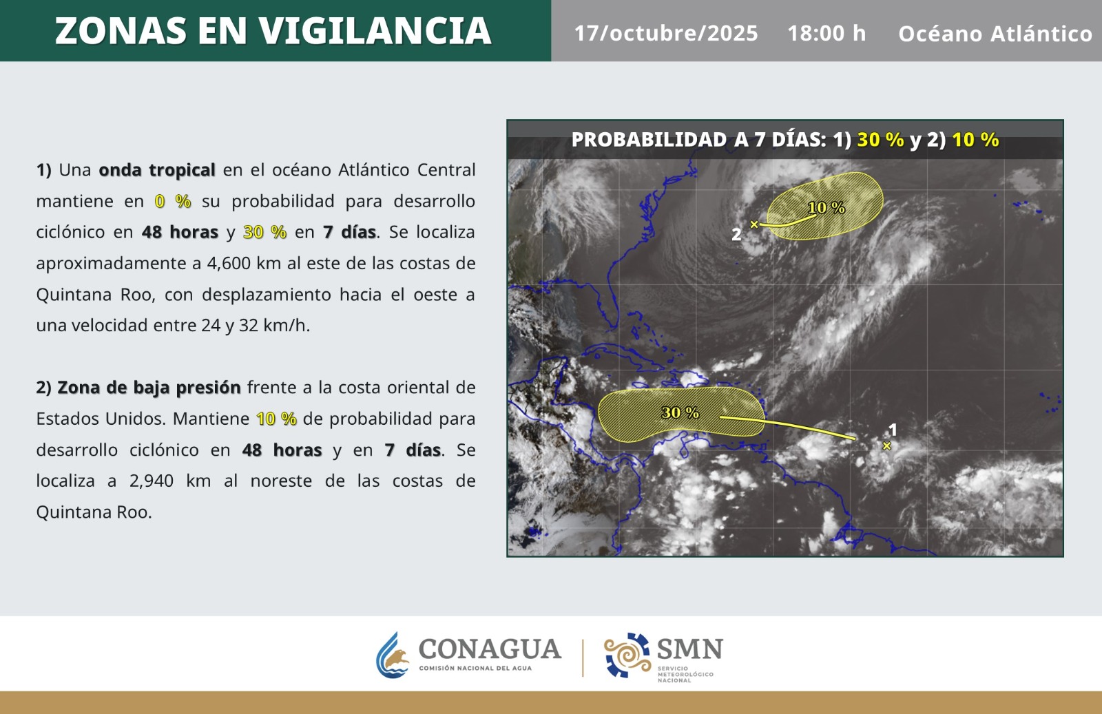 1) Una onda tropical en el océano Atlántico Central mantiene en 0 % su probabilidad para desarrollo ciclónico en 48 horas y 30 % en 7 días. Se localiza aproximadamente a 4,600 km al este de las costas de Quintana Roo, con desplazamiento hacia el oeste a una velocidad entre 24 y 32 km/h.