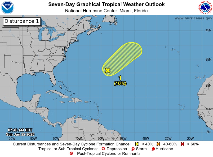 Se ha generado una zona de baja presión en el Atlántico Central. Presenta 10 % de probabilidad para desarrollo ciclónico en 48 horas y en 7 días.