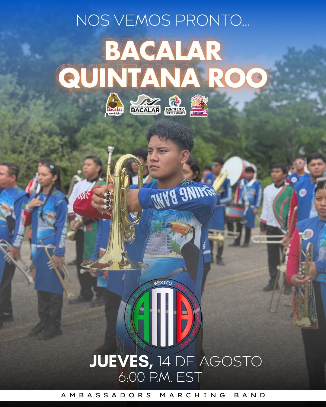 La banda de guerra y escoltas de Ambassadors Marching Band de la Escuela Secundaria Técnica México de Belice, así como antorchistas del hermano pais de Belice, participarán el jueves en la inauguración de la Feria San Joaquín Bacalar, Quintana Roo. Con gran entusiasmo, los jóvenes estudiantes y antorchistas se han preparado para darle realce a la tradicional Feria San Joaquín, Bacalar, en una muestra de hermandad y gestiones del presidente municipal, Jose Alfredo Contreras Mendez y el cónsul honotrario,José Luis Kelly.