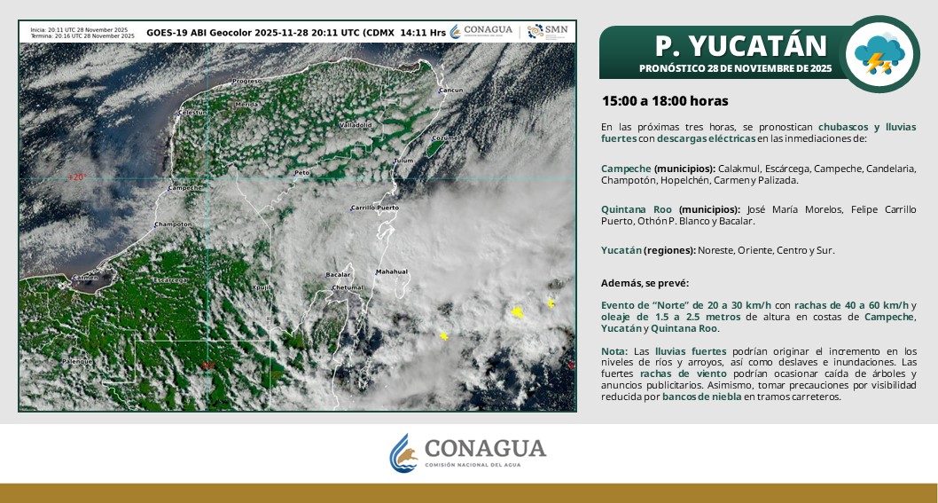 En las próximas tres horas, se pronostican chubascos y lluvias puntuales fuertes con descargas eléctricas en los municipios de: José María Morelos, Felipe Carrillo Puerto, Othón P. Blanco y Bacalar.
