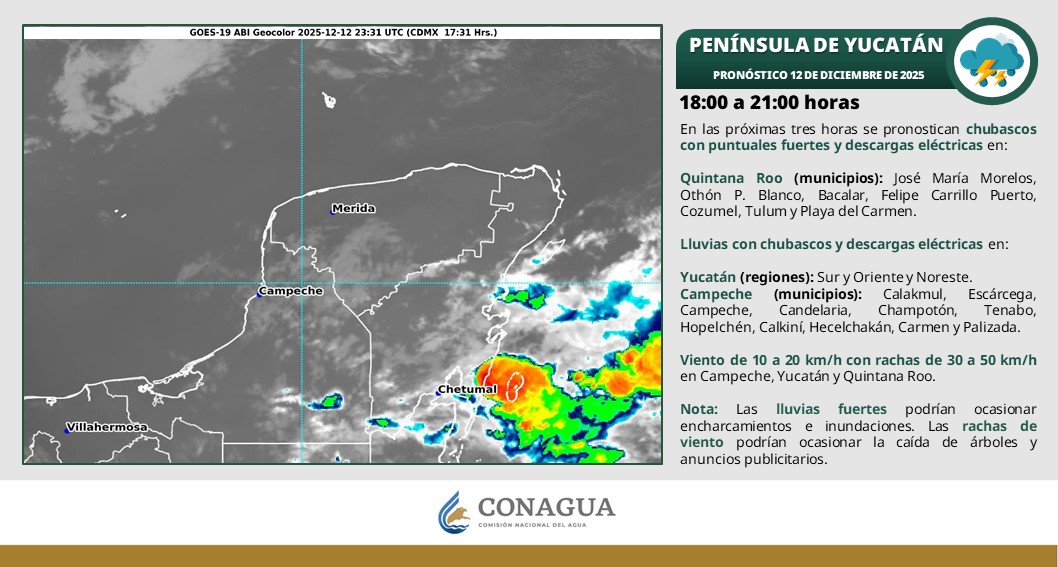 En las próximas tres horas, se pronostican chubascos con lluvias puntuales fuertes y descargas eléctricas en los municipios de: José María Morelos, Othón P. Blanco, Bacalar, Felipe Carrillo Puerto, Cozumel, Tulum y Playa del Carmen.
