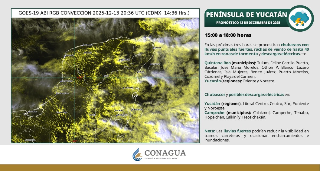 En las próximas tres horas, se pronostican chubascos con lluvias puntuales fuertes, rachas de viento de hasta 40 km/h en zonasde tormenta y descargas eléctricas en los municipios de: Tulum, Felipe Carrillo Puerto, Bacalar, José María Morelos, Othón P. Blanco, Lázaro Cárdenas, Isla Mujeres, Benito Juárez, Puerto Morelos, Cozumel y Playa del Carmen.