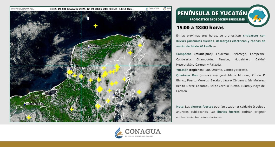 En las próximas tres horas, se pronostican chubascos con Iluvias puntuales fuertes, descargas eléctricas y rachas de viento de hasta 50 km/h en