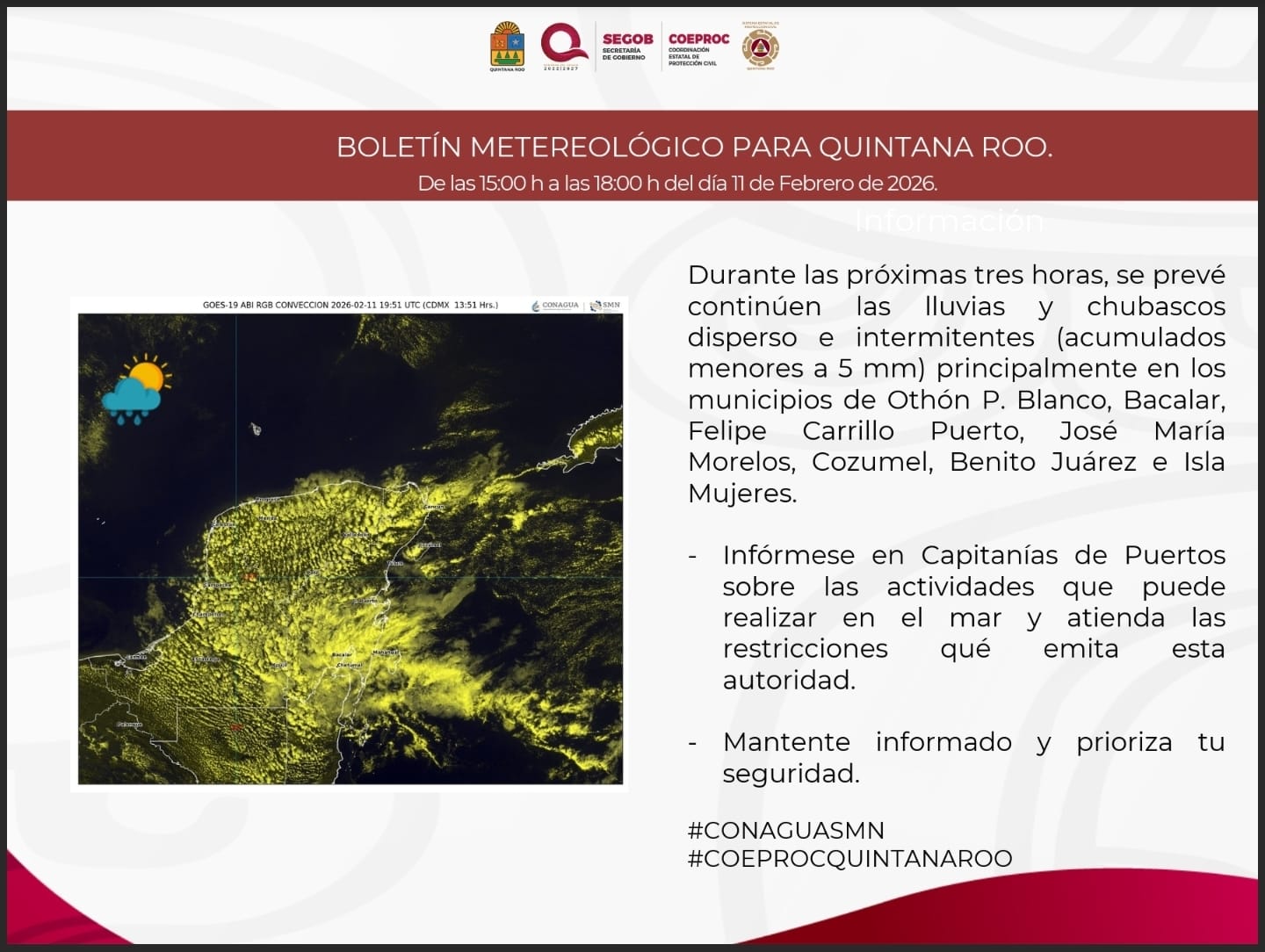 Durante las próximas tres horas, se prevé continúen las Iluvias y chubascos dispersos e intermitentes (acumulados menores a 5 mm) principalmente en los municipios de: Othón P. Blanco, Bacalar, Felipe Carrillo Puerto, José María Morelos, Cozumel, Benito Juárez e Isla Mujeres.