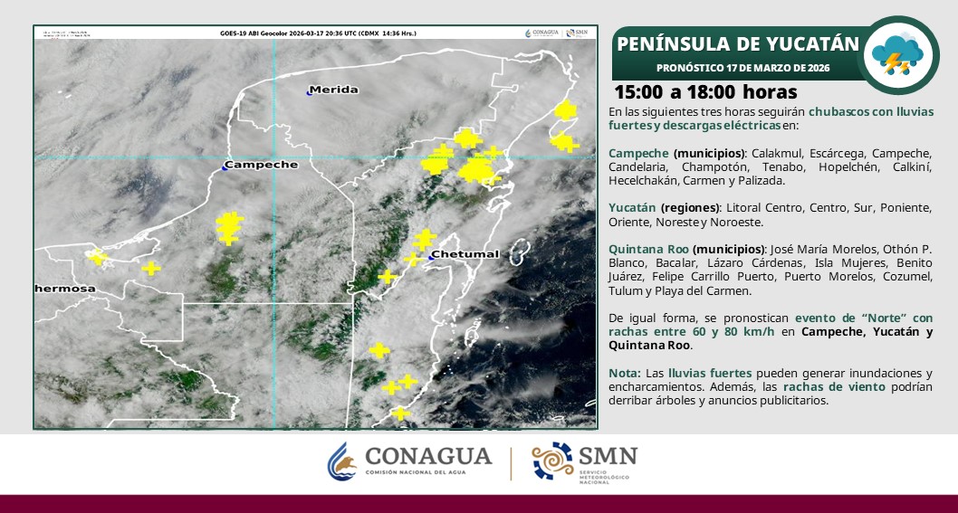 En las siguientes tres horas continuarán los chubascos con Iluvias fuertes y descargas eléctricas en los municipios de: José María Morelos, Othón P. Blanco, Bacalar, Lázaro Cárdenas, Isla Mujeres, Benito Juárez, Felipe Carrillo Puerto, Puerto Morelos, Cozumel, Tulum y Playa del Carmen.