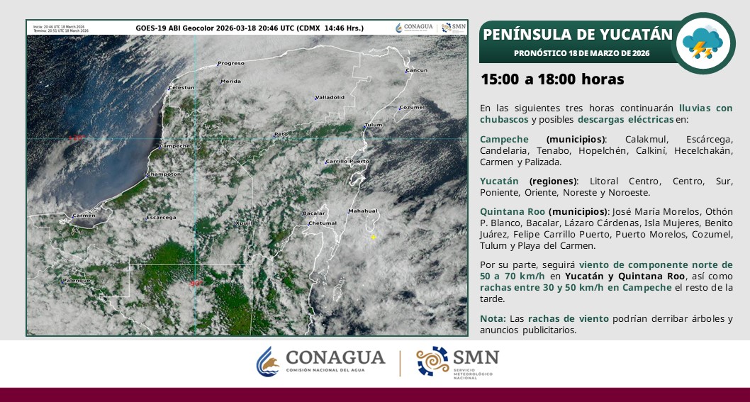 En las siguientes tres horas continuarán lluvias con chubascos y posibles descargas eléctricas en los municipios de: José María Morelos, Othón P. Blanco, Bacalar, Lázaro Cárdenas, Isla Mujeres, Benito Juárez, Felipe Carrillo Puerto, Puerto Morelos, Cozumel, Tulum y Playa del Carmen.