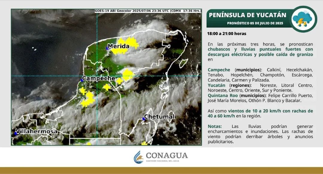 En las próximas tres horas, se pronostican chubascos y Iluvias puntuales fuertes con descargas eléctricas en los municipios de: Felipe Carrillo Puerto, José María Morelos, Othón P. Blanco y Bacalar.