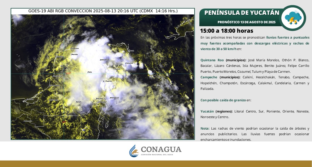 Se prevé en las próximas tres horas continúen las lluvias fuertes a puntuales muy fuertes acompañadas con descargas eléctricas y rachas de viento de 30 a 50 km/h en los municipios de: José María Morelos, Othón P. Blanco, Bacalar, Lázaro Crdenas, Isla Mujeres, Benito Juárez, Felipe Carrillo Puerto, Puerto Morelos, Cozumel Tulum y Playa de Carmen.