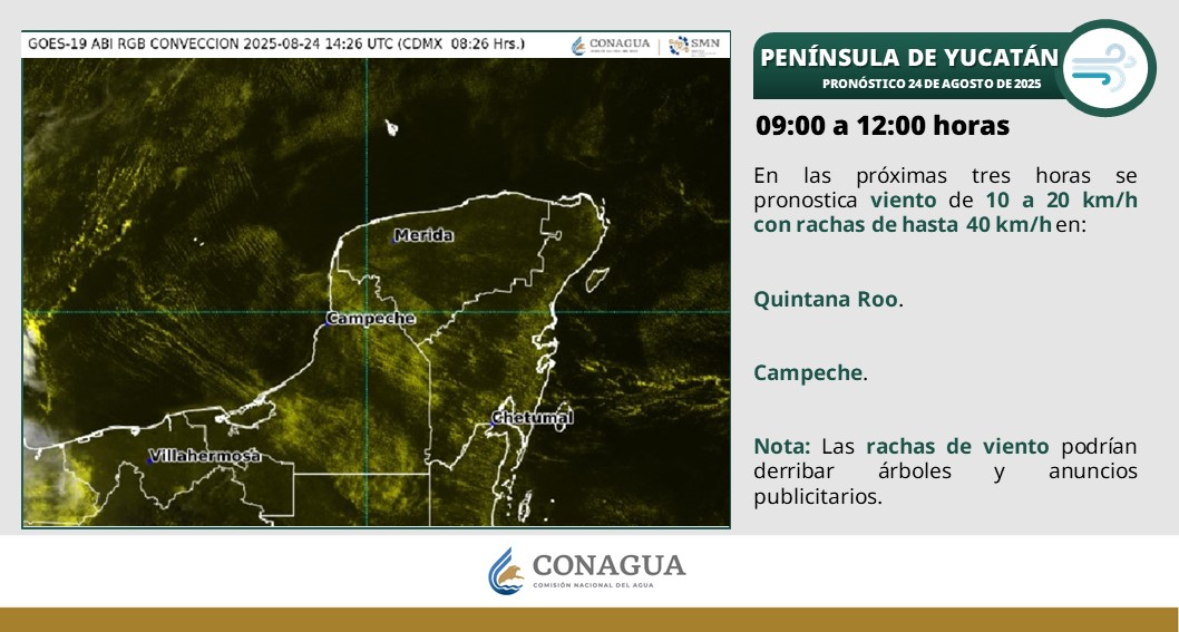 En las próximas tres horas se pronostica viento de 10 a 20 km/h con rachas de hasta 40 km/h principalmente sobre las zonas de costa del estado.