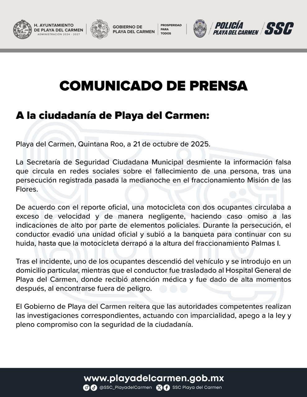 El Gobierno de Playa del Carmen reitera que las autoridades competentes realizan las investigaciones correspondientes, actuando con imparcialidad, apego a la ley y pleno compromiso con la seguridad de la ciudadanía.