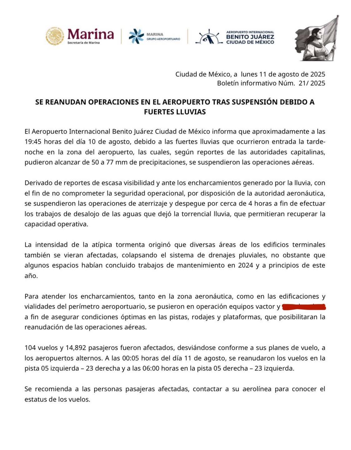 El Aeropuerto Internacional de la Ciudad de México (AICM) Benito Juárez, emite comunicado sobre la reanudación de operaciones que había sido suspendida por las fuertes lluvias de la noche.