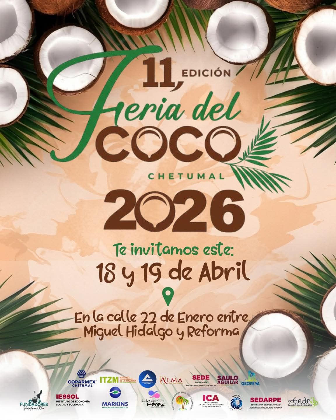 Con el respaldo de la Coparmex, Sede, Sedarpe, ICA, Iesool y el Tecnológico de la Zona Maya, la décima primera edición de la Feria del Coco vendrá a posicionar a este evento que busca impulsar la diversidad económica de la zona sur mediante la producción y transformación del coco, un producto icónico de la región, proveniente del árbol de la vida, ya que prácticamente todas sus partes pueden ser aprovechadas.