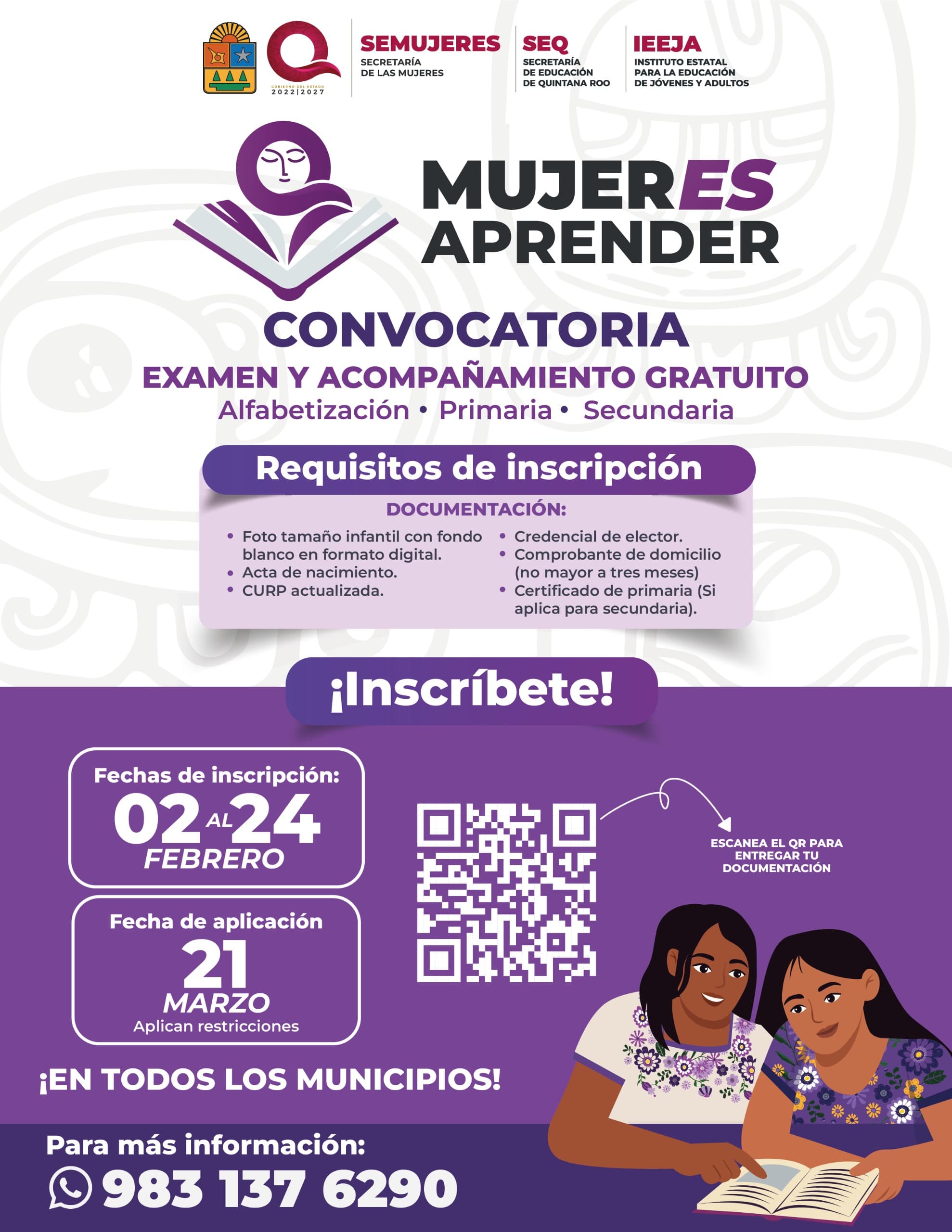 Chetumal.- La Secretaría de las Mujeres de Quintana Roo (SEMUJERES) lanza la primera jornada de 2026, para inscripción y aplicación del examen del programa Mujer Es Aprender de nivel básico, una estrategia para el empoderamiento educativo de las mujeres, que ofrece acompañamiento y evaluación gratuita para que las participantes concluyan su proceso de alfabetización, primaria o secundaria.