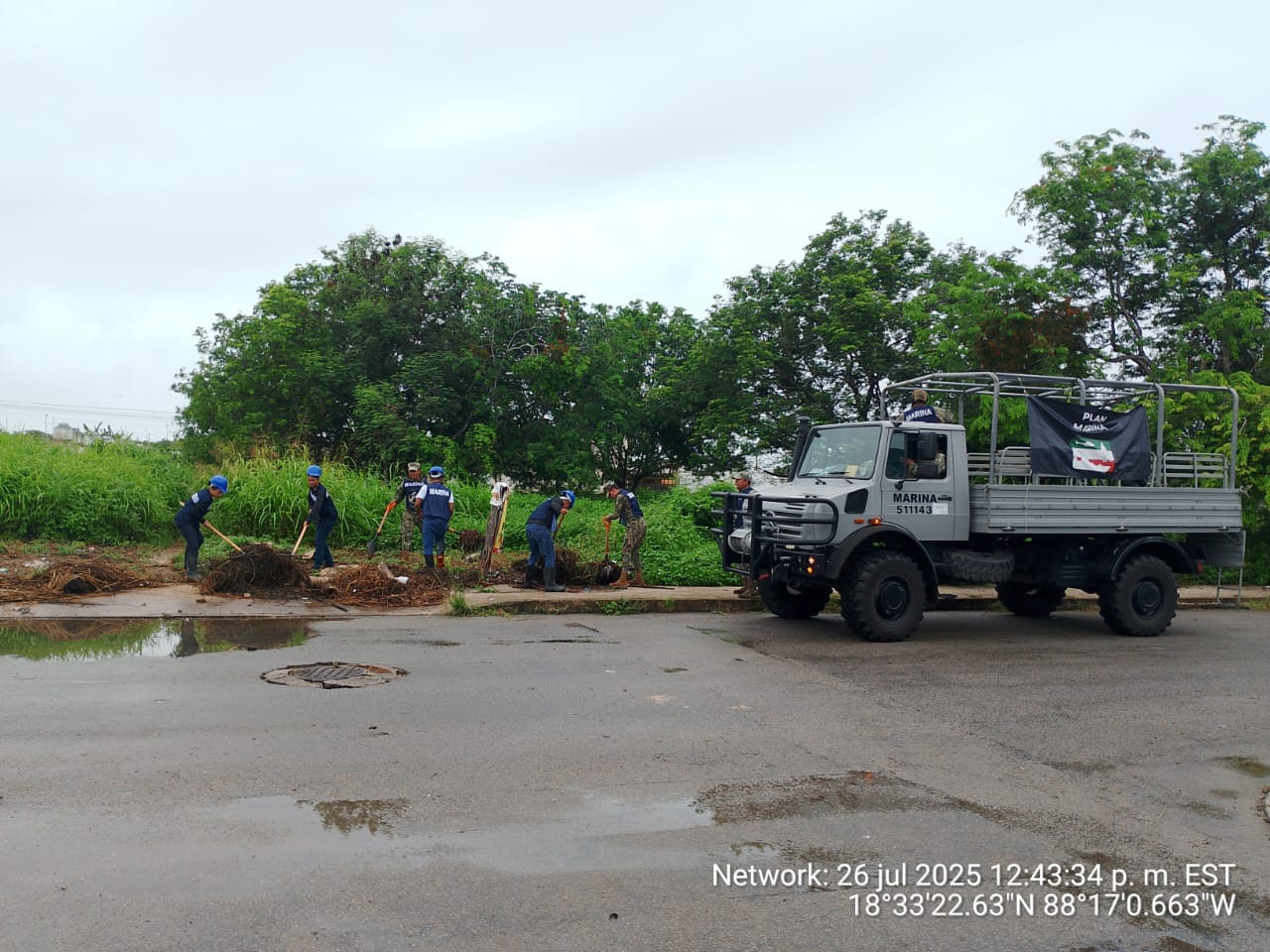 En este contexto y en coordinación con autoridades de protección civil, se desplegaron vehículos y personal naval en la Colonia Pacto Obrero Campesino, con el fin de liberar vías obstruidas por escombro, lodo y basura a causa de las lluvias atípicas.