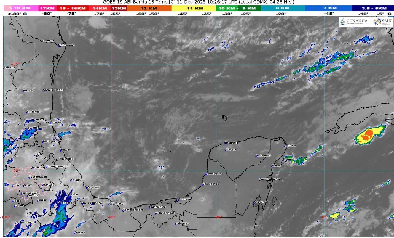 Entrada de humedad del mar caribe hacia la península de Yucatán, originará en el estado de Quintana Roo cielo parcialmente nublado con incremento de nublados durante el transcurso del día, intervalos de chubascos con lluvias puntuales fuertes (25 a 50 mm), ambiente caluroso durante el día. Viento con rachas de 40 km/h. Se prevé bancos de niebla en zonas rurales, urbanas y tramos carreteros.