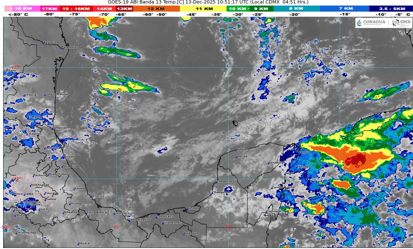 Entrada de humedad del mar caribe hacia la península de Yucatán, originará en el estado de Quintana Roo cielo medio nublado a nublado durante el transcurso del día, lluvias fuertes con puntuales muy fuertes (50 a 75 mm), ambiente caluroso durante el día. Viento con rachas de 40 km/h. Se prevén bancos de niebla en zonas rurales, urbanas y tramos carreteros.