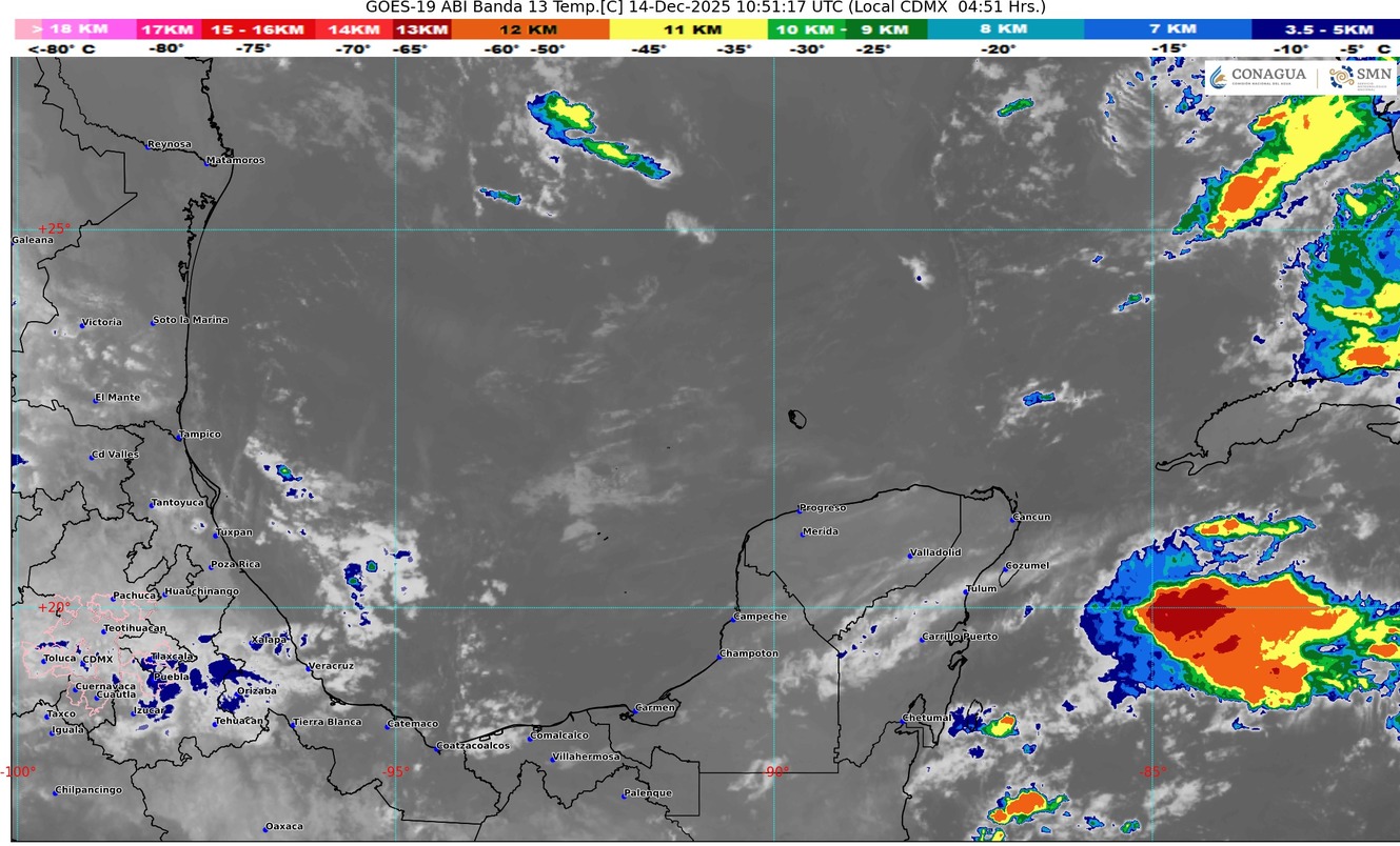 Una vaguada en altura localizada sobre la península de Yucatán y el acercamiento del frente frío número Veintiuno a la región peninsular, originarán en el estado de Quintana Roo cielo medio nublado a nublado durante el transcurso del día, lluvias fuertes con puntuales muy fuertes (50 a 75 mm), ambiente caluroso durante el día. Viento con rachas de 50 km/h. Se prevé bancos de niebla en zonas rurales, urbanas y tramos carreteros.