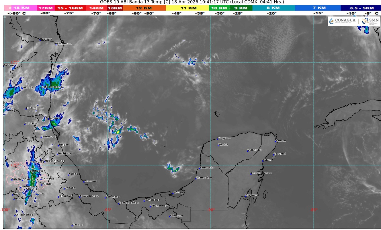 Afluencia de aire marítimo con poco contenido de humedad del mar Caribe hacia la península de Yucatán, mantendrán sobre el estado de Quintana Roo cielo parcialmente nublado durante el transcurso del día, lluvias aisladas (acumulados menores a 5 mm), ambiente caluroso. Viento con rachas de 30 a 50 km/h y oleaje de 2.0 a 3.0 metros de altura en costa del norte del estado.