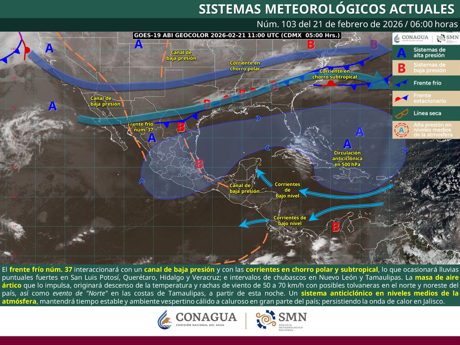 El frente frío 37 se desplazará sobre el noreste del país, origina viento fresco del norte, lluvias y descenso de la temperatura sobre su área de influencia.