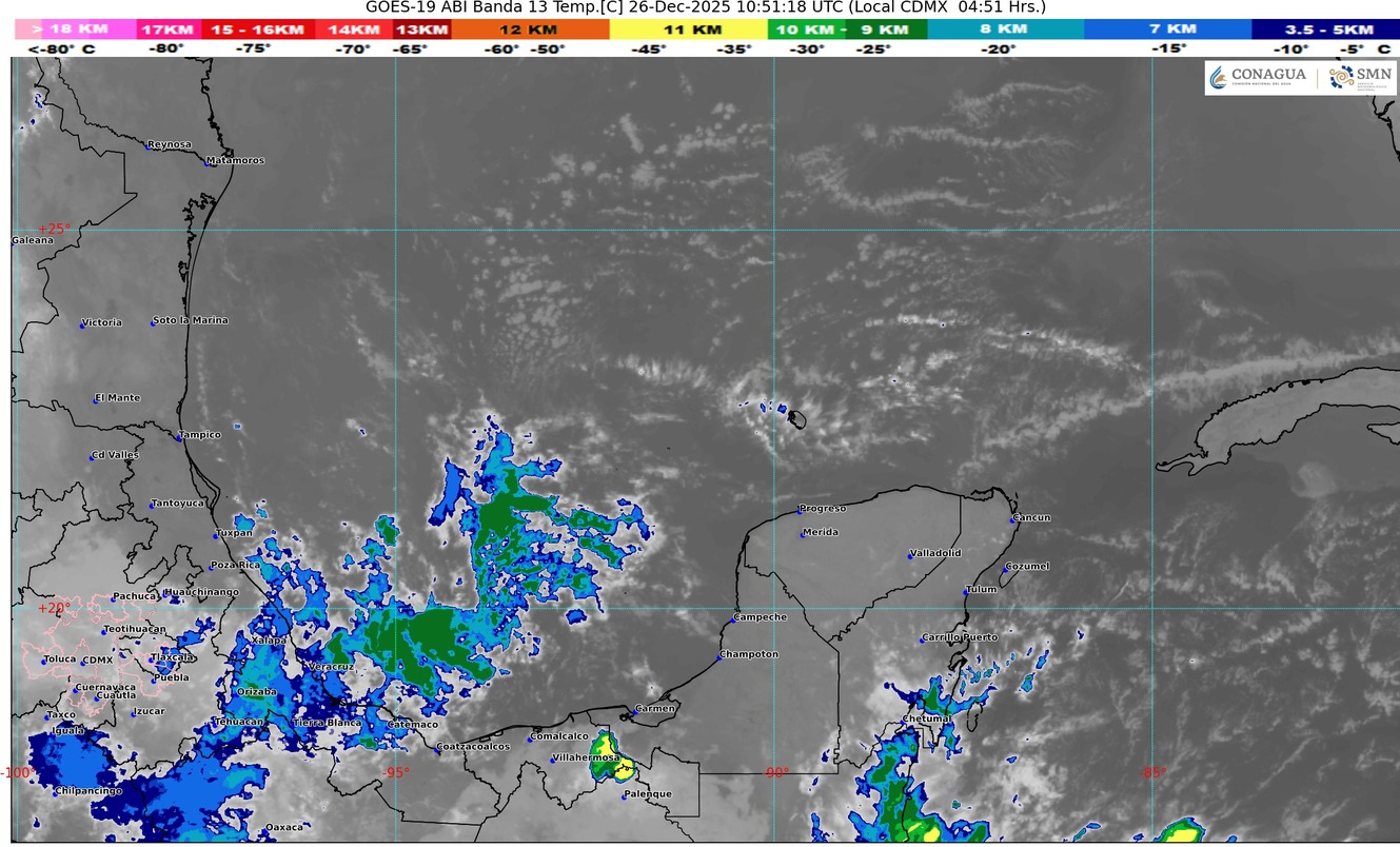 Sistema de alta presión localizado al norte del golfo de México y la entrada de humedad del mar Caribe hacia la península de Yucatán, mantendrán en el estado de Quinta Roo cielo parcialmente nublado con incremento de nublados durante el transcurso del día, lluvias con intervalos de chubascos (acumulados de 5 a 25 mm), ambiente caluroso durante el día y templado al amanecer. Viento con rachas de 50 km/h. Se prevén bancos de niebla en zonas rurales, urbanas y tramos carreteros.