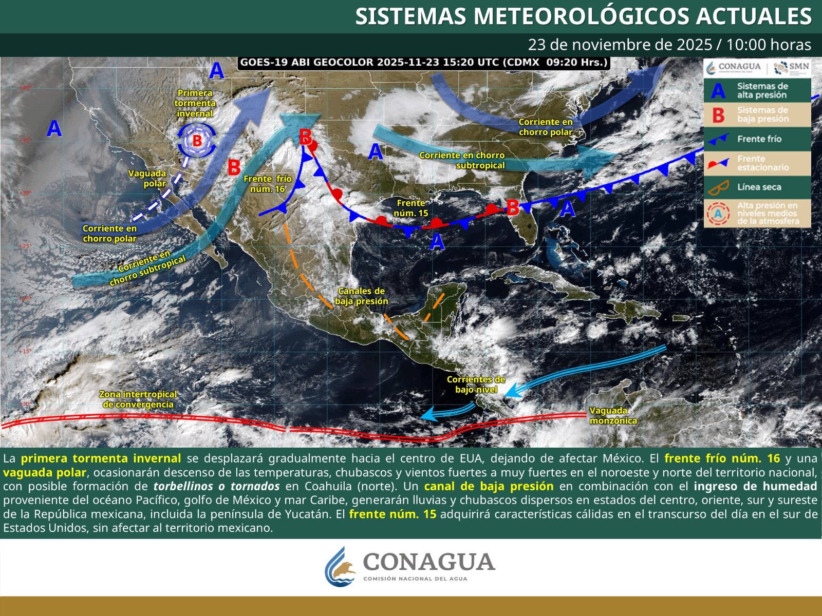 La primera tormenta invernal se desplazará gradualmente hacia el centro de EUA, dejando de afectar México. El frente frío núm. 16 y vaguada polar, ocasionarán descenso de las temperaturas, chubascos y vientos fuertes a muy fuertes en el noroeste y norte del territorio nacional, con posible formación de torbellinos o tornados en Coahuila (norte). Un canal de baja presión en combinación con el ingreso de humedad proveniente del océano Pacífico, golfo de México y mar Caribe, generarán lluvias y chubascos dispersos en estados del centro, oriente, sur y sureste de la República mexicana, incluida la península de Yucatán.