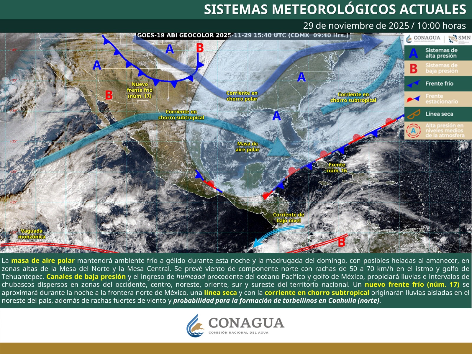 La masa de aire polar mantendrá ambiente frío a gélido durante esta noche y la madrugada del domingo, con posibles heladas al amanecer en zonas altas de la Mesa del Norte y la Mesa Central. Se prevé viento de componente norte con rachas de 50 a 70 km/h en el istmo y golfo Tehuantepec. Canales de baja presión y el ingreso de humedad procedente del océano Pacífico y golfo de México, propiciará Iluvias e intervalos chubascos dispersos en zonas del occidente, centro, noreste, oriente, sur y sureste del territorio nacional. Un nuevo frente frío (núm. 17) aproximará durante la noche a la frontera norte de México, una línea seca y con la corriente en chorro subtropical originarán lluvias aisladas en el noreste del país, además de rachas fuertes de viento y probabilidad para la formación de torbellinos en Coahuila (norte).