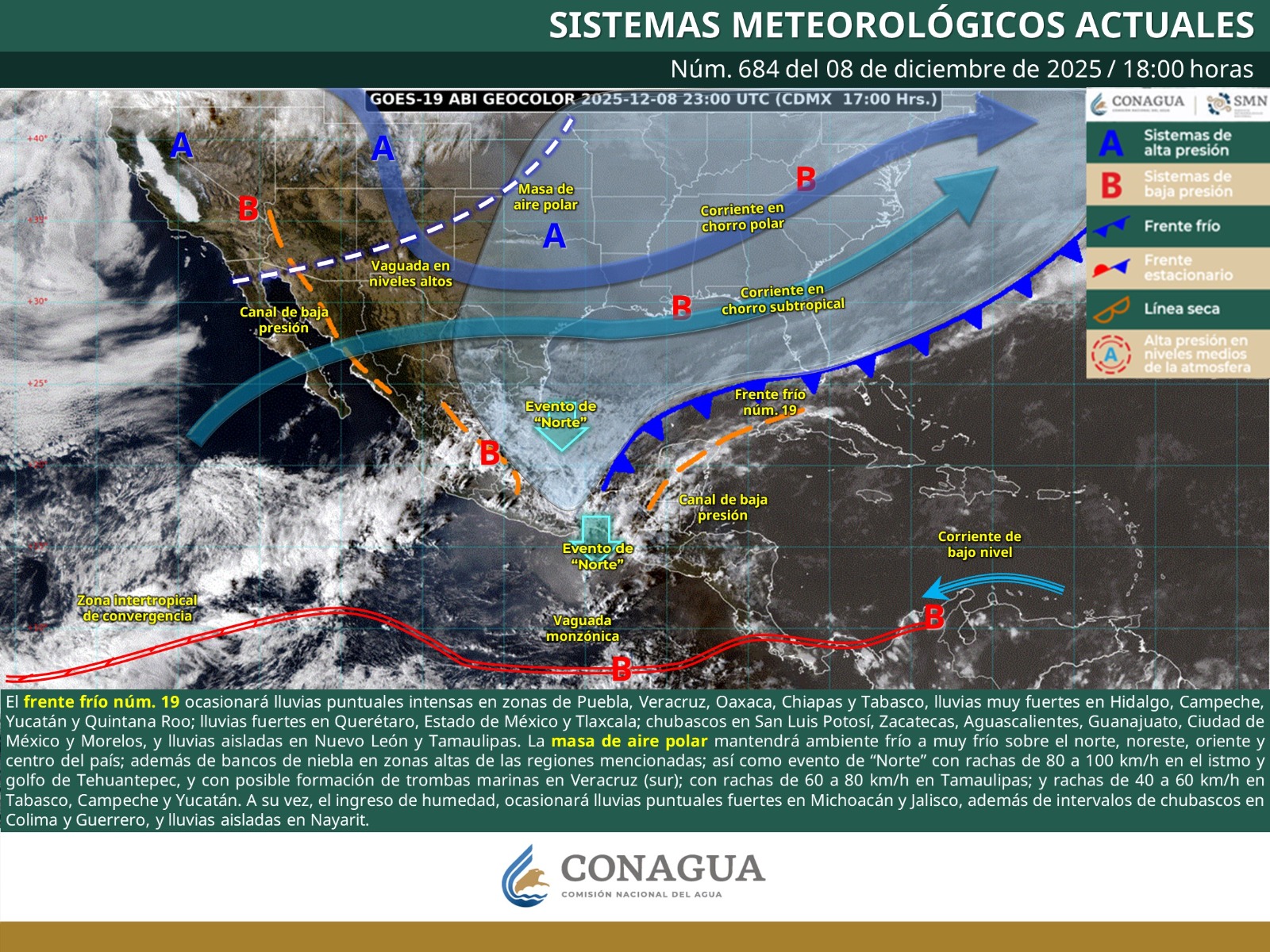 El frente frío núm. 19 ocasionará lluvias puntuales intensas en zonas de Puebla, Veracruz, Oaxaca, Chiapas y Tabasco, lluvias muy fuertes en Hidalgo, Campeche, Yucatán y Quintana Roo; lluvias fuertes en Querétaro, Estado de México y Tlaxcala; chubascos en San Luis Potosí, Zacatecas, Aguascalientes, Guanajuato, Ciudad México y Morelos, y lluvias aisladas en Nuevo León y Tamaulipas. La masa de aire polar mantendrá ambiente frío a muy frío sobre el norte, noreste, oriente centro del país; además de bancos de niebla en zonas altas de las regiones mencionadas; así como evento de “Norte” con rachas de 80 a 100
