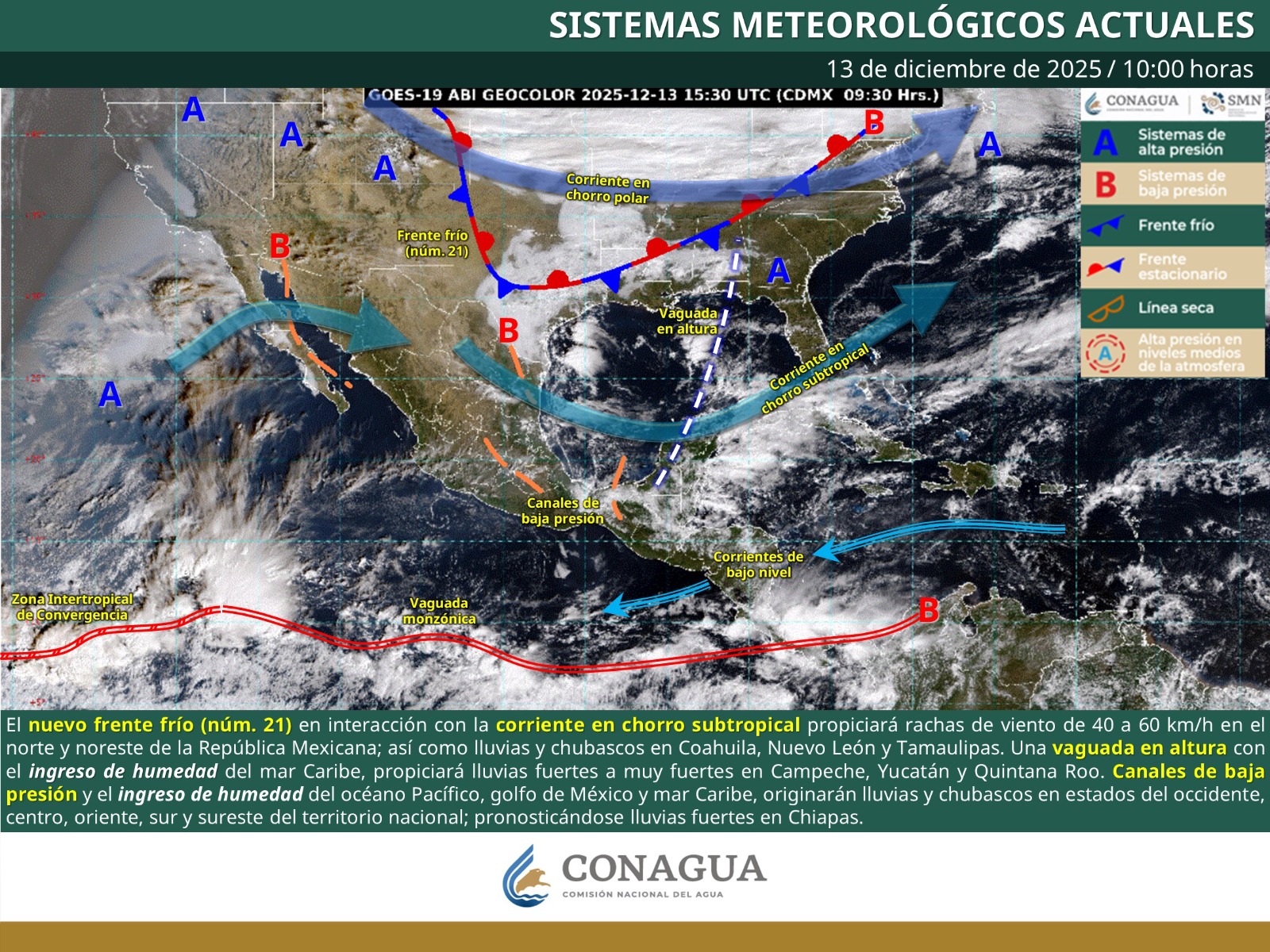 El nuevo frente frío (núm. 21) en interacción con la corriente en chorro subtropical propiciará rachas de viento de 40 a 60 km/h en norte y noreste de la República Mexicana; así como lluvias y chubascos en Coahuila, Nuevo León y Tamaulipas. Una vaguada en altura el ingreso de humedad del mar Caribe, propiciará lluvias fuertes a muy fuertes en Campeche, Yucatán y Quintana Roo. Canales de baja presión y el ingreso de humedad del océano Pacífico, golfo de México y mar Caribe, originarán lluvias y chubascos en estados del occidente, centro, oriente, sur y sureste del territorio nacional; pronosticándose lluvias fuertes en Chiapas.