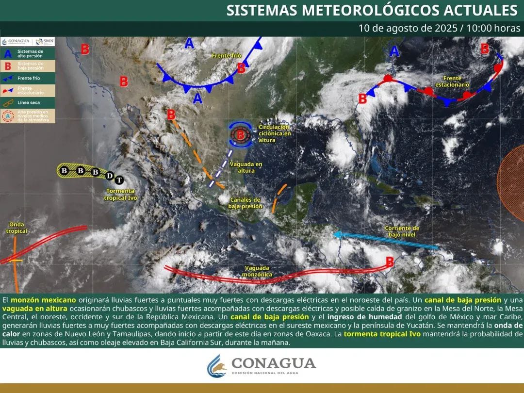 El monzón mexicano originará lluvias fuertes a puntuales muy fuertes con descargas eléctricas en el noroeste del país. Un canal de baja presión y una vaguada en altura ocasionarán chubascos y Iluvias fuertes acompañadas con descargas eléctricas y posible caída de granizo en la Mesa del Norte, la Mesa Central, el noreste occidente y Sur de la República Mexicana. Un canal de baja presión y el ingreso de humedad del golfo de México y mar Caribe, Jenerarán lluvias fuertes a muy fuertes acompañadas con descargas eléctricas en el sureste mexicano y la península de Yucatán. Se mantendrá la onda de calor en zonas de Nuevo León y Tamaulipas, dando inicio a partir de este dia en zonas de Oaxaca.