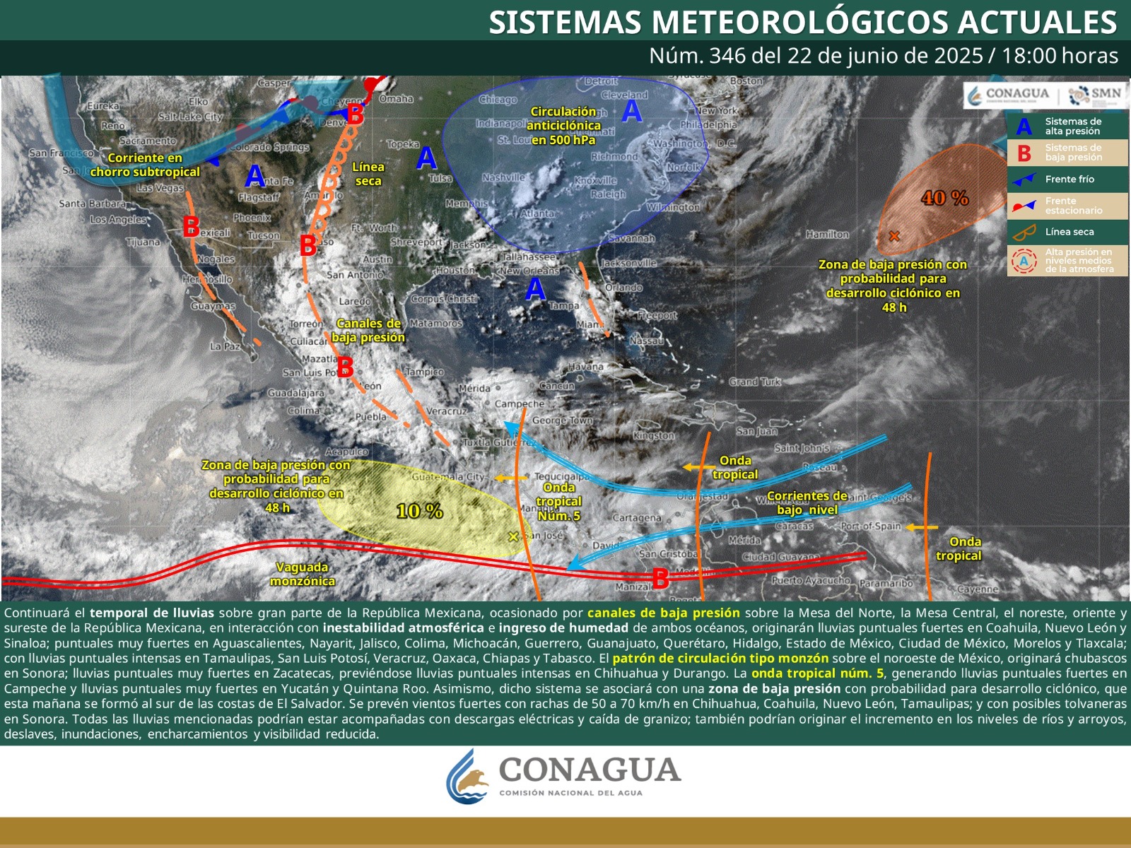Continuará el temporal de lluvias sobre gran parte de la República Mexicana, ocasionado por canales de baja presión sobre la Mesa del Norte, la Mesa Central, el noreste, oriente y sureste de la República Mexicana, en interacción con inestabilidad atmosférica ingreso de humedad de ambos océanos.